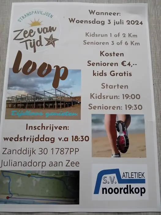 Zee van tijdOp woensdagavond 3 juli vindt bij strandpaviljoen Zee van Tijd in Julianadorp aan Zee, de Zee van Tijd-loop 2024 plaats. Om 19.00 is de start van de 1 en 2 km kidsrun en om 19.30 is de start van de 3 km en 6 km. De kidsrun is gratis, voor de andere onderdelen bedraagt […]