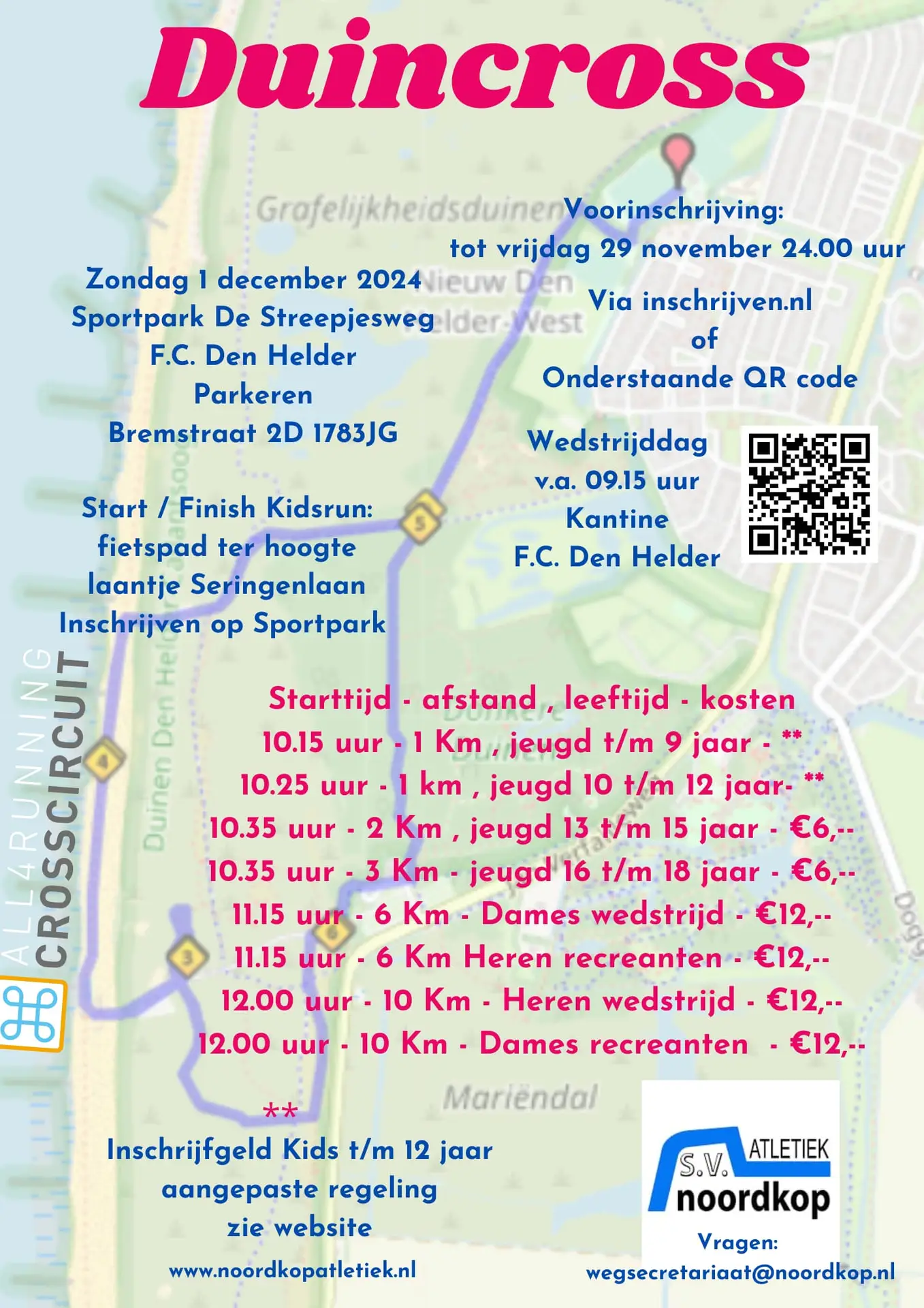 Streepjesberg Bremstraat, Den Helder, Noord-Holland, NetherlandsDuincross - zondag 1 december 2024SV Noordkop Atletiek organiseert wederom dit jaar in samenwerking met FC Den Helder de 37e editie van deze populaire crossloop op zondag 1 december vanaf de Streepjesberg.Deze cross maakt deel uit van het All4Running Cross-circuit die 27 oktober start met de Parkcross in Hoorn, maar ook gewoon los daarvan gelopen […]