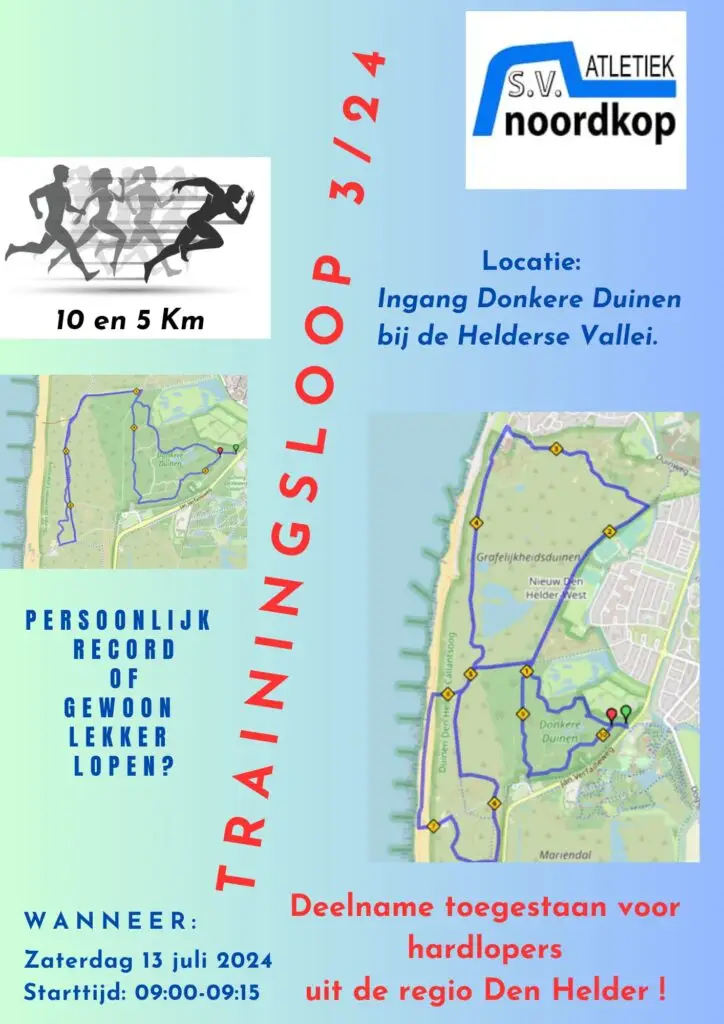Trainingsloop 3 op 13 Juli Voor alle lopers in Den Helder en omstreken. Noordkop zet het parcours uit en een klok neer bij de ingang van de Donkere Duinen. Van